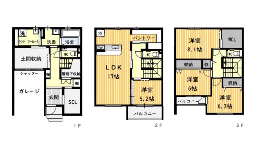 - シャッター、トイレ(各階)、洗面、風呂、ランドリールーム、キッチン(3口)、パントリー、収納、ウォークインクローゼット、バルコニー、浴室暖房乾燥機、インターネット無料