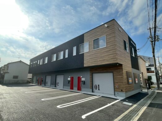 1階倉庫、2階事務所の人気タイプで、各区画前面空地に3台の駐車も可能です。